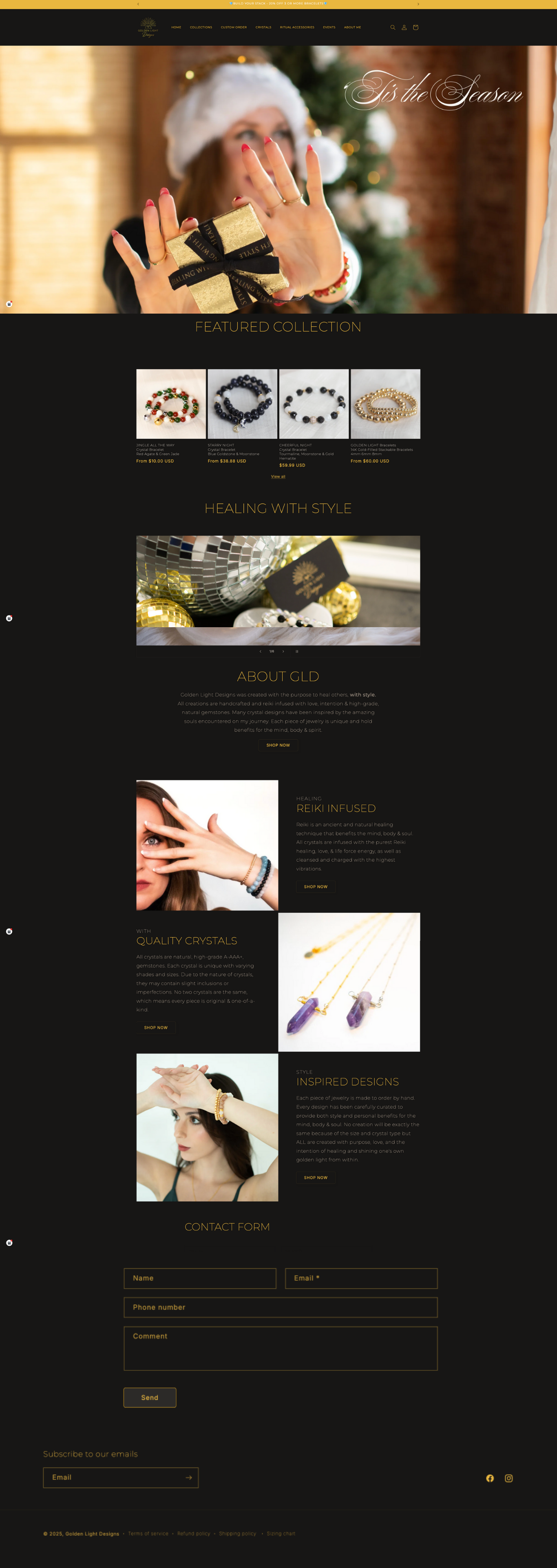 A crystal jewelry and reiki healing shop that transitioned from Etsy to Shopify. The site features a calendar of monthly events and a focus on spiritual, healing-centered design.